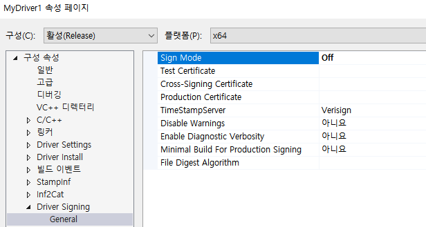 1. 프로젝트 속성 페이지에서 드라이버 서명 모드를 Off로 합니다.