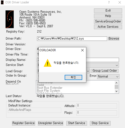 3. OSRLOADER로 드라이버를 로드합니다. (Browse -> Register Service -> Start Service)