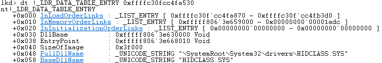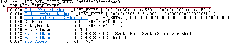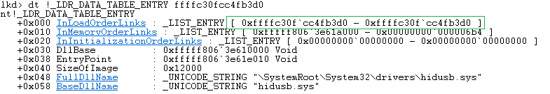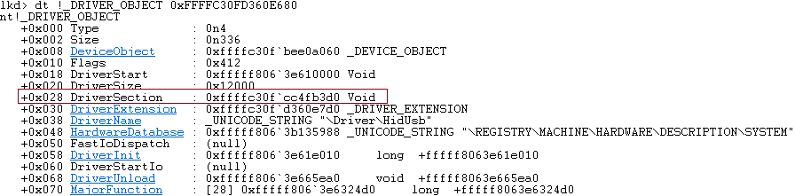 hidusb.sys를 샘플로 잡고 windbg에서 DRIVER_OBJECT 구조체를 살펴보면 0x28 오프셋에 DriverSection이 있는데 이는 LDR_DATA_TABLE_ENTRY 구조체를 가리킨다.