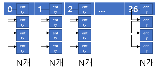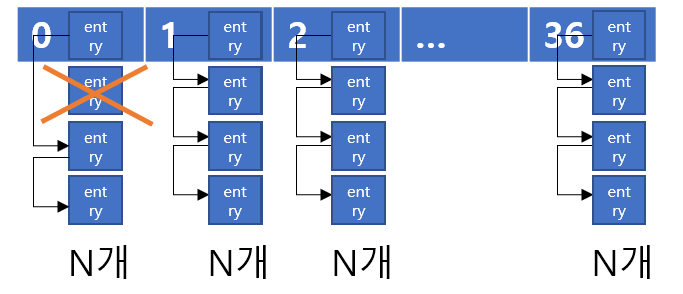 운영체제는 각각의 Name에서 Hash Index 를 계산해 각 배열에 삽입하는 방식입니다. 따라서 연결된 Entry의 갯수는 일정하지 않습니다.