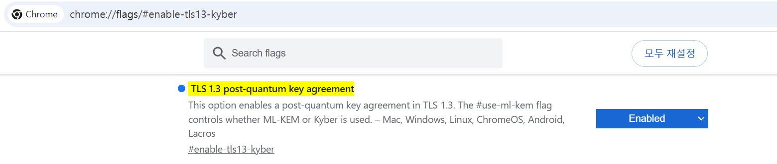 만약 크롬을 사용중이라면, 아래에 접속하여 TLS 1.3 kyber 사용을 활성화 할 수 있다.