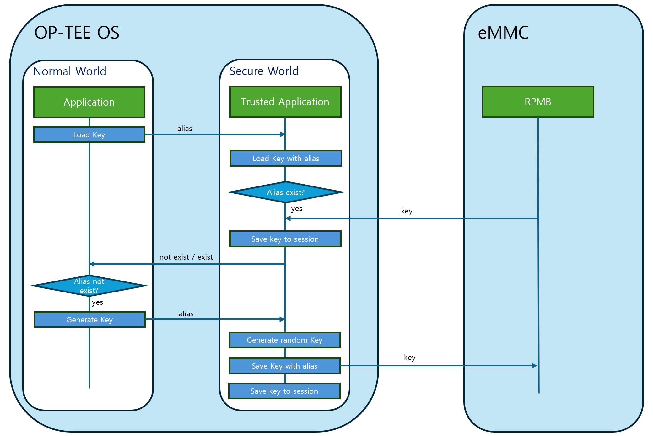 별칭(alias)을 지정하여 키에 접근한다. (TA간 키는 공유할 수 없다. 즉, alias가 동일하더라도, 다른 TA의 alias에 접근할 수 없다.) RPMB에 키가 존재하지 않으면, 키를 생성하여 저장한다.