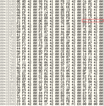 LEA EAX,DWORD PTR DS:[EDI+EAX*4] // EAX = 7(복호화 된 인덱스 번호), EDI = 41E600(베이스 주소)