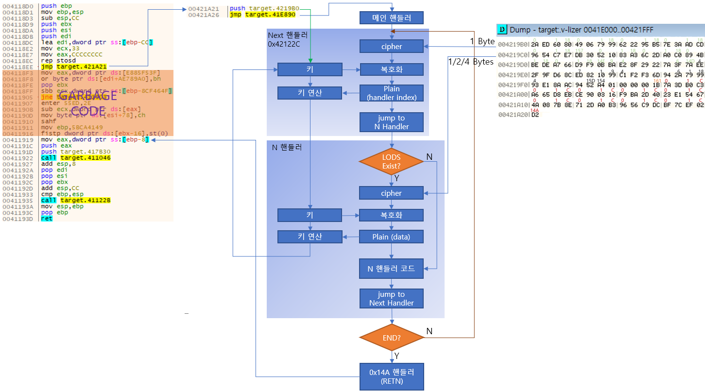 메인 핸들러에서 초기화 작업을 한 후, 스택 저장(Prolog 핸들러) → 매크로 코드 블럭에 대응하는 핸들러 → 스택 복원(Epilog 핸들러) → RETN 순으로 동작하고 마지막으로 다음 EIP로 복귀합니다.