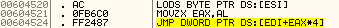 JMP DWORD PTR DS:[EDI+EAX*4] // 41E600+(2D*4) = JMP [41E6B4] -> JMP 41F566 (0번 핸들러)