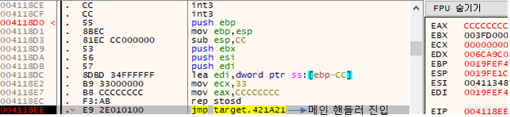 JMP DWORD PTR DS:[EDI+EAX*4] // 41E600+(0x89*4) = JMP [41E824] -> JMP 421482 (1번 핸들러)