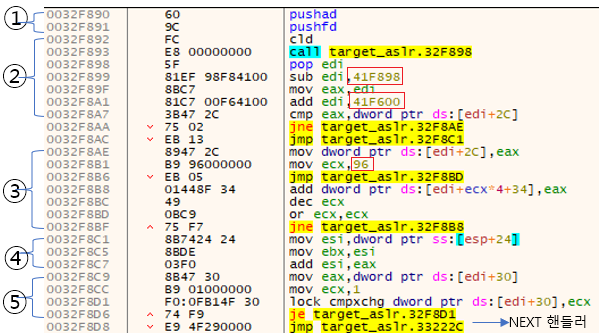 JMP DWORD PTR DS:[EDI+EAX*4] // 41E600+(2D*4) = JMP [41E6B4] -> JMP 41F566 (0번 핸들러)